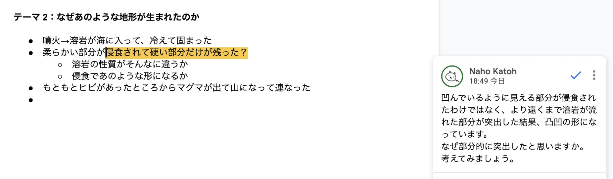Googleドキュメントを使用したワークシートであれば,教員も同時に記入できます.気になる記述を見付けてその場でコメントを付けたり,ヒントや追加の指示を投げかけたりと,直接テキストでやりとりすることができるため,チャットの代用となります.