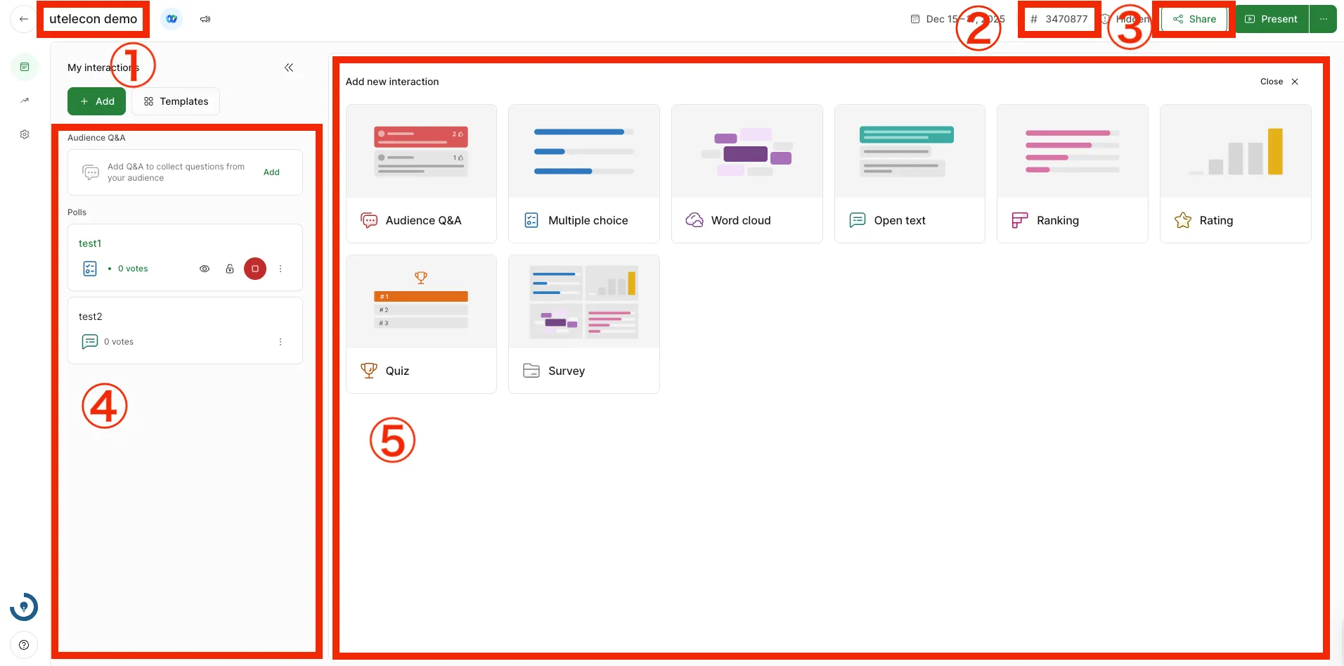 To create a poll, select “Add (Add new interaction)” in the upper left corner of the screen. There are six types of single questions and a Survey, which allows you to run them together. You can create a new poll by clicking the button of each function icon from the poll function screen.