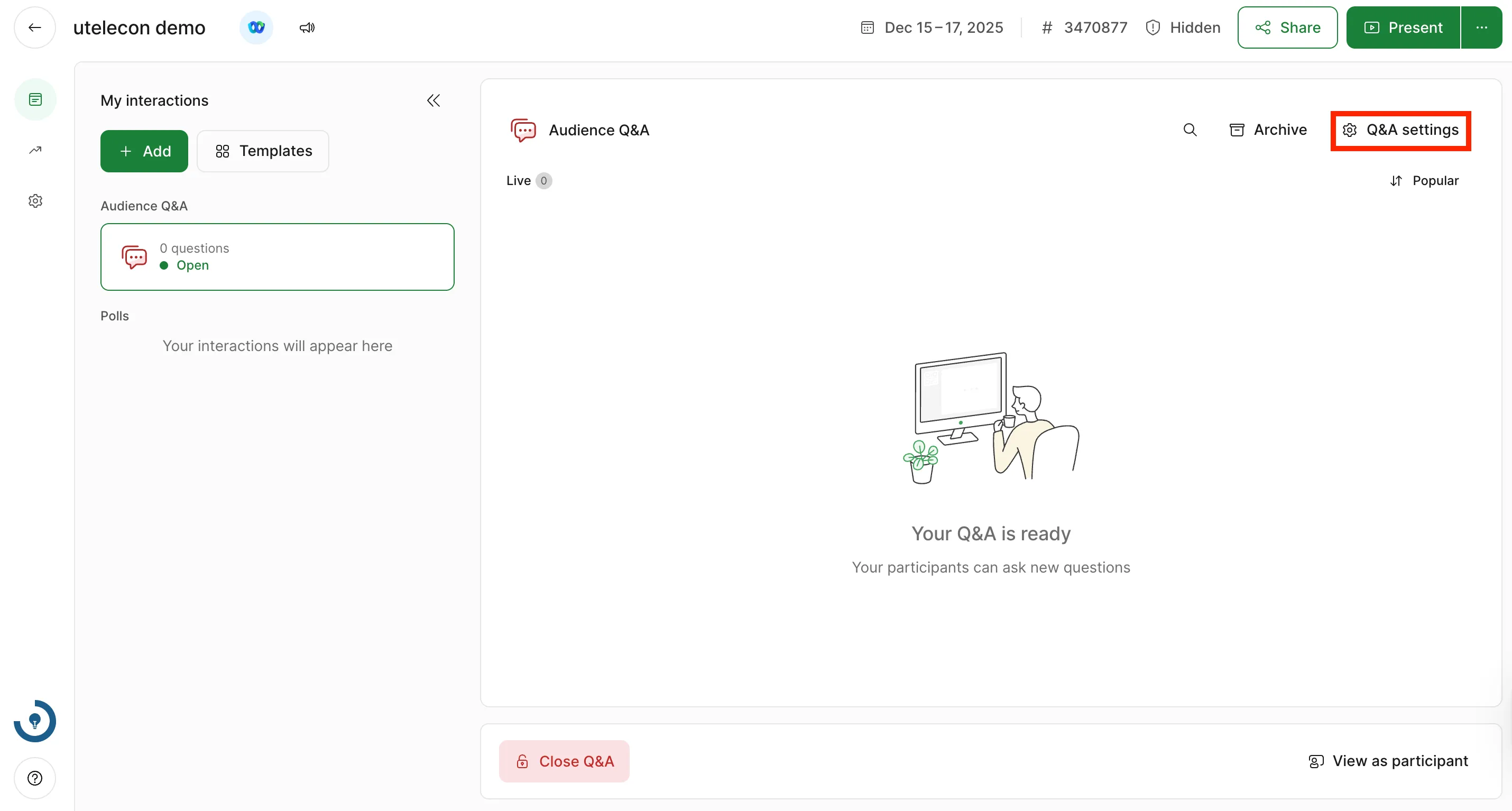 To create a Q&A, select “Audience Q&A” in the upper left corner of the screen or under “Add new interaction”.