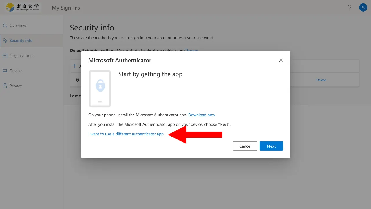- Click “I want to use a different authentication app”.