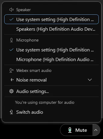 Click the arrow signs to the right of the “Mute” and “Camera” buttons to choose the speaker, microphone, and camera you want to use for Webex.