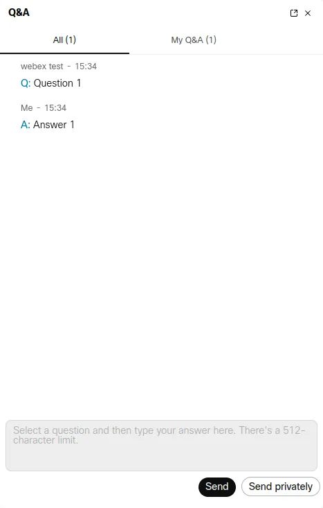 Click “Q&A” to send a question to the host, presenter, or (if you are using Webex Webinars) the panelist.